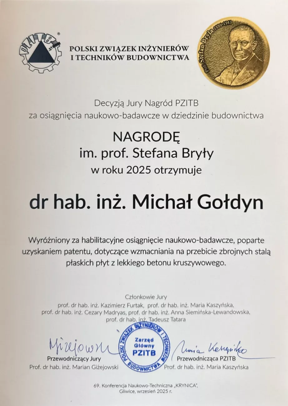 Dr hab. inż. Michał Gołdyn z Katedry Budownictwa Betonowego został laureatem Nagrody im. prof. Stefana Bryły w 2025 roku. Wyróżnienie wręczono podczas uroczystego otwarcia 69. Krynickiej Konferencji Naukowej Komitetu Inżynierii Lądowej i Wodnej PAN oraz Komitetu Nauki PZITB, która odbyła się w dniach 21–24 września w Gliwicach.