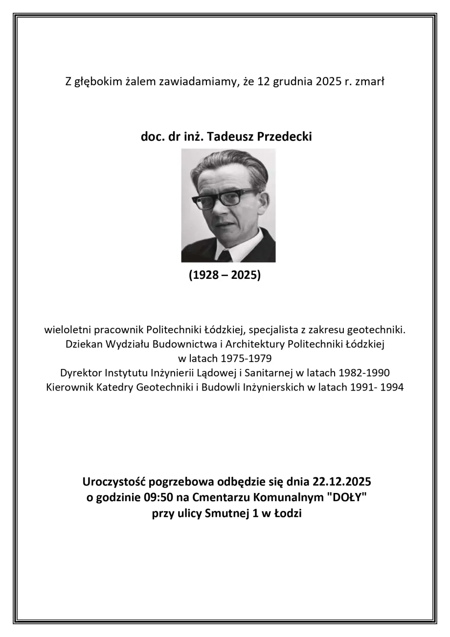 access_time Data dodania 17/12/2025 - 10:22 bookmark_border Kategorie Aktualności Z żalem informujemy, że zmarł doc. dr inż. Tadeusz Przedecki, związany zawodowo z Politechniką Łódzką. Image Rodzinie oraz wszystkim bliskim składamy najszczersze wyrazy współczucia.